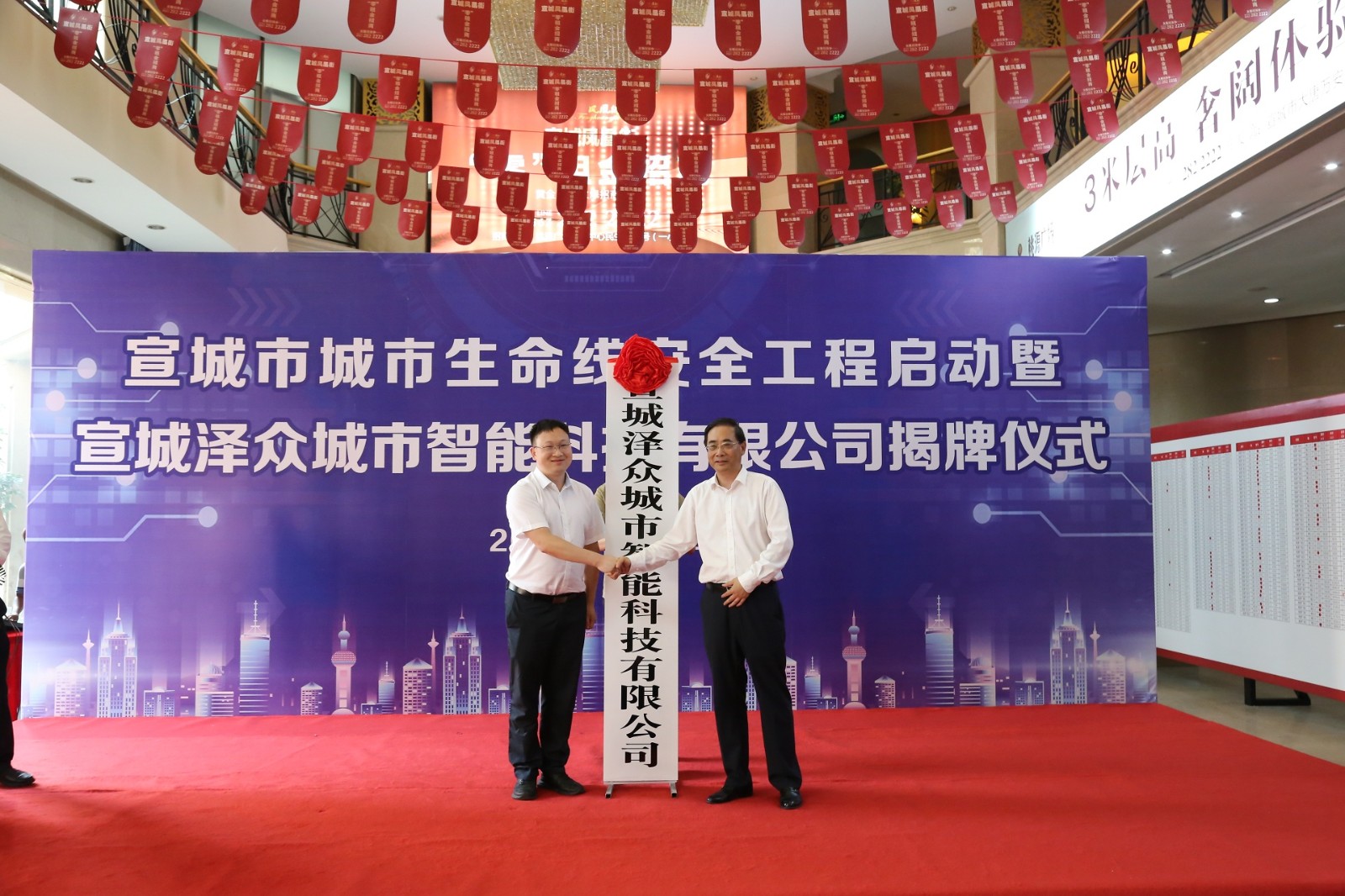 9月27日,宣城市城市生命線安全工程啟動暨宣城澤眾智能科技有限公司揭牌儀式在市城建集團(tuán)一樓舉行。宣城市政府副市長王普和清華大學(xué)合肥公共安全研究院院長助理、合肥澤眾城市智能科技有限公司首席科學(xué)家付明共同為公司揭牌。宣城市政府副秘書長雷江升、市城管執(zhí)法局局長孫恒志等參加儀式。